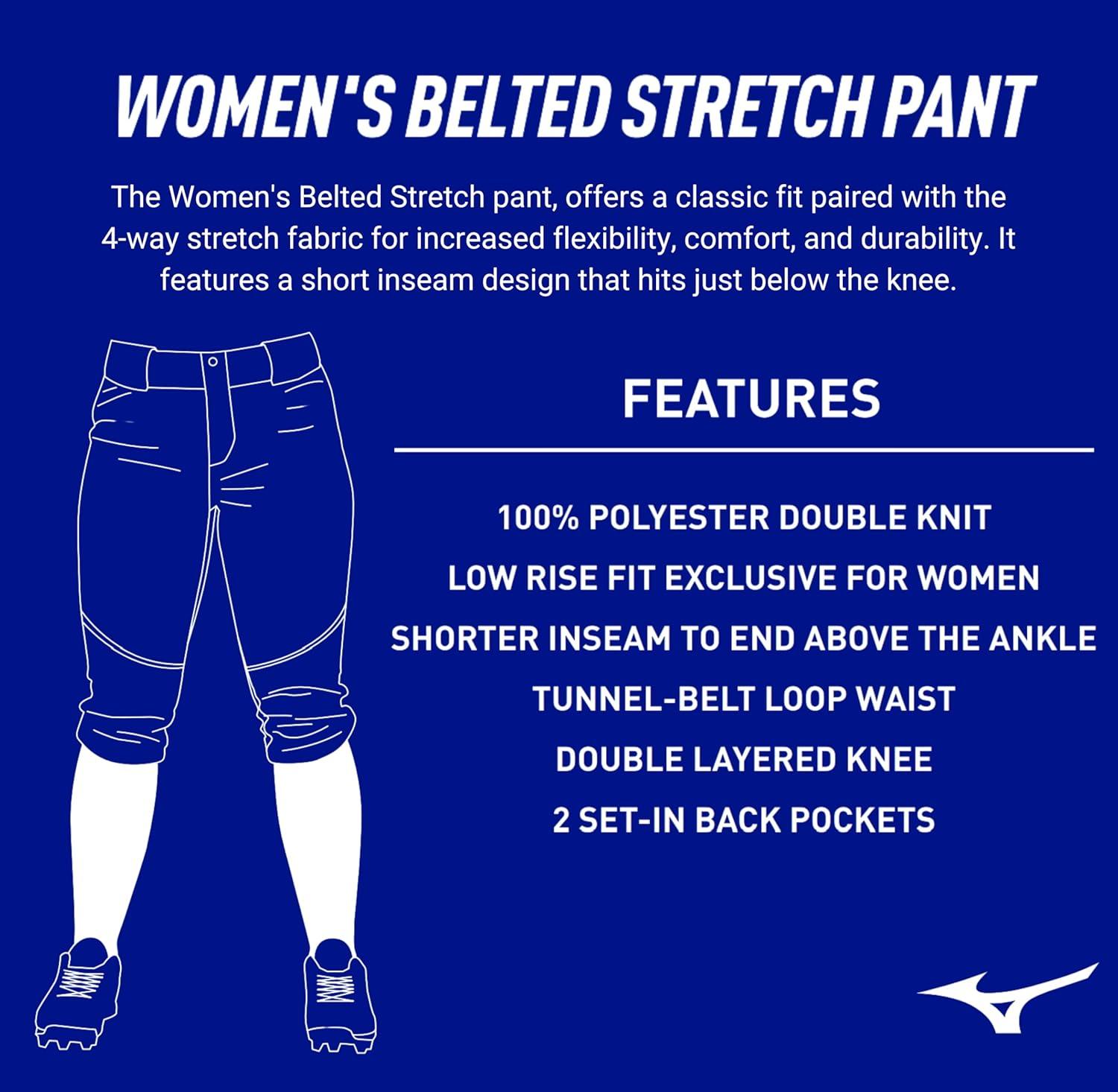 Mizuno's stretch softball pant now with tunnel belt loops. Made with a premium 4-Way Stretch fabric for increased flexibility, comfort, and durability. Made to withstand tough play with reinforced dual-layer knee construction. Also featuring Mizuno's DRYLITE technology to help manage moisture for added comfort.